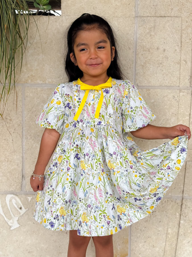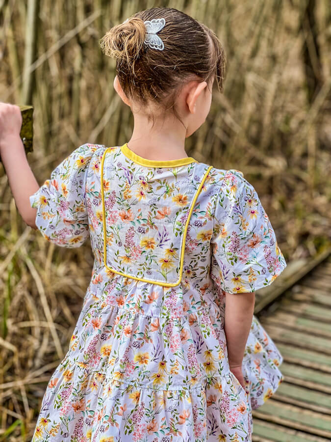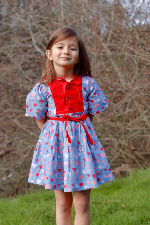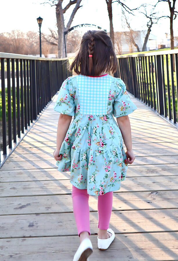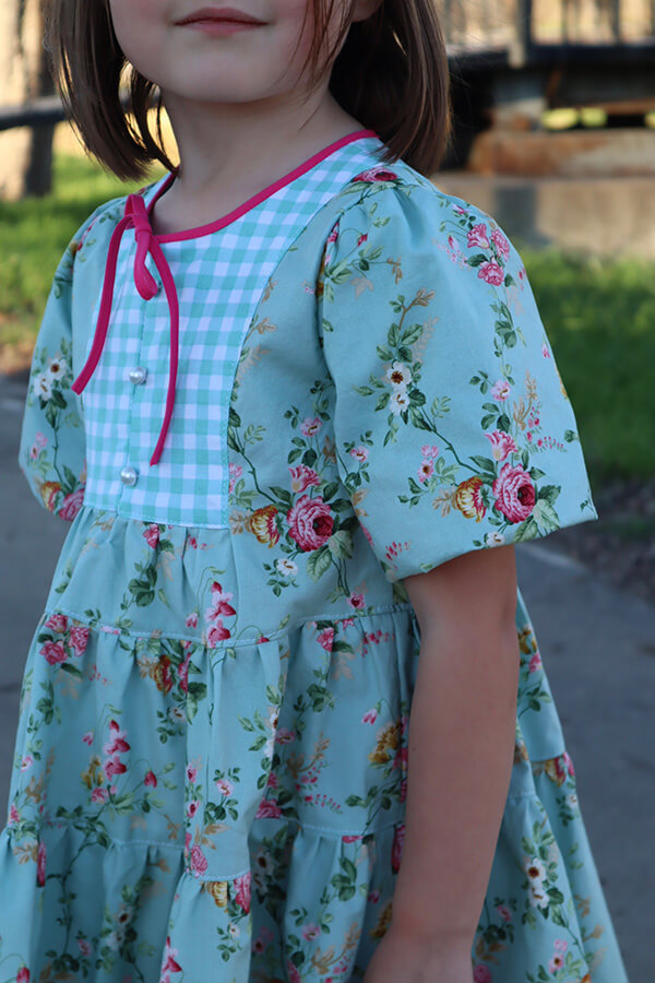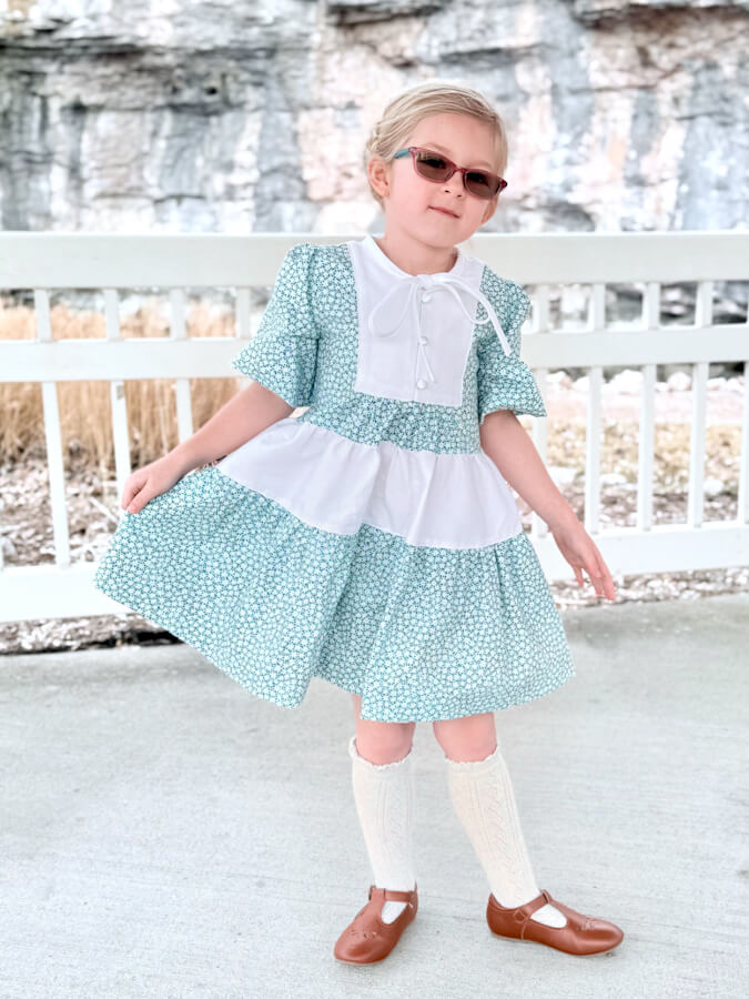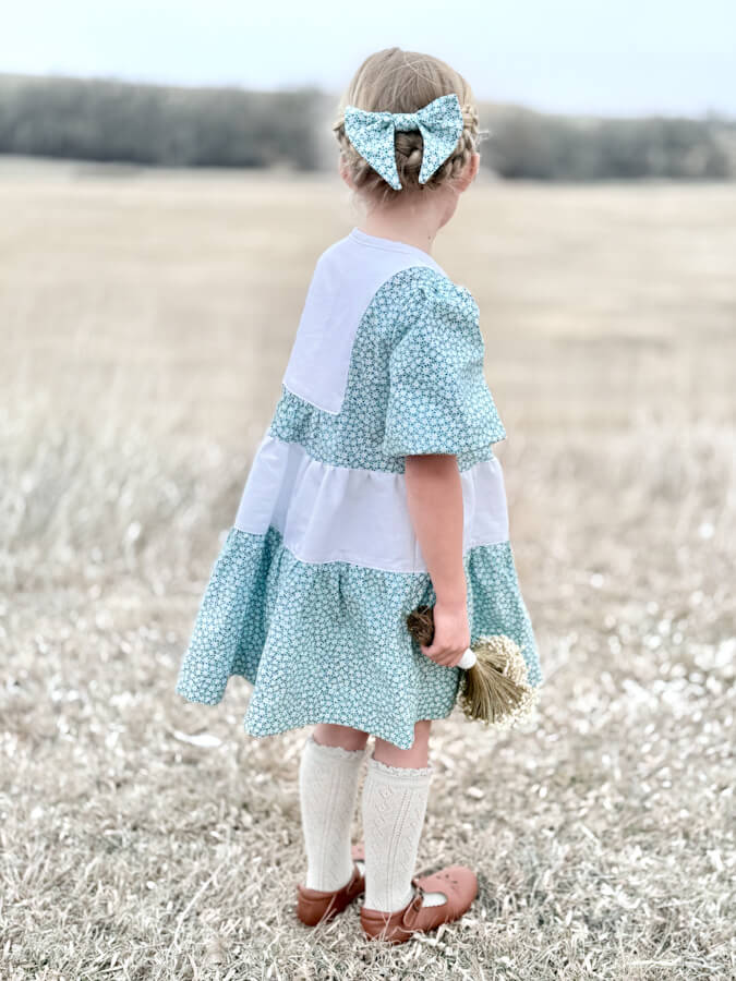The Freya Sewing Pattern is a timeless, vintage-inspired top and dress pattern designed for girls, tweens, and women, offering exceptional versatility and classic charm. Perfect for spring and year-round wear, Freya is ideal for woven fabrics such as cotton, linen, and soft florals. This sewing pattern features a beautifully detailed, fully lined plastron bib on both the front and back, delicate bodice gathering, and fully lined puff sleeves with no elastic for a polished finish. Freya can be sewn as a hip-length top or as a tiered dress in either standard or vintage length, with the option to add a removable tie waist for a more defined silhouette or wear it as a relaxed babydoll style. Available in girls’ sizes 2T–9/10, tweens’ sizes 10–16, and women’s sizes 0–20, the Freya pattern is thoughtfully designed for comfortable movement, growth, and heirloom-quality sewing projects that blend vintage boho style with modern wearability.