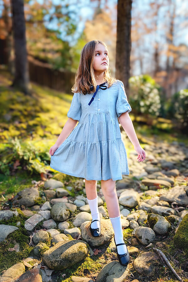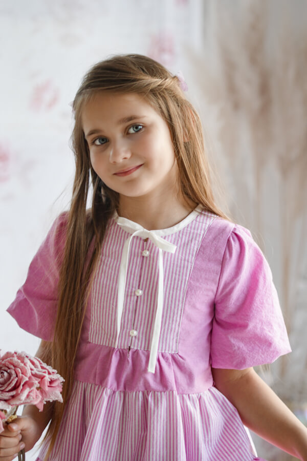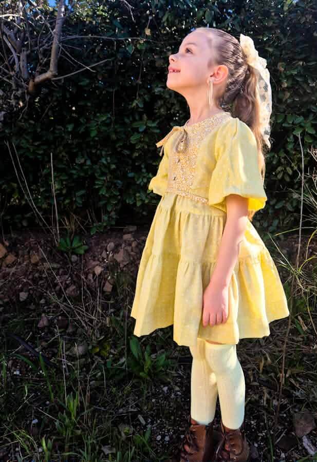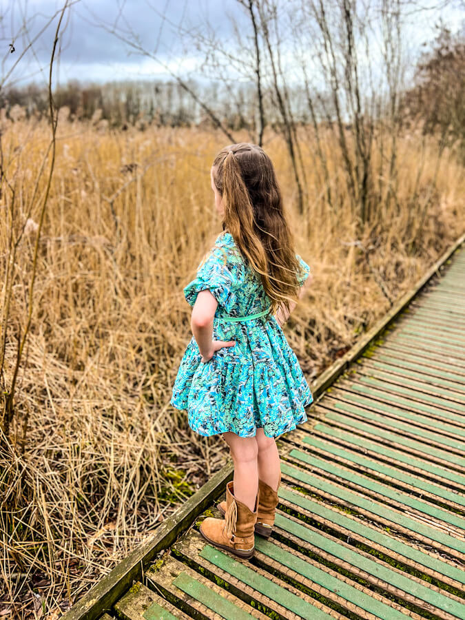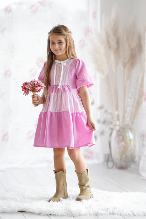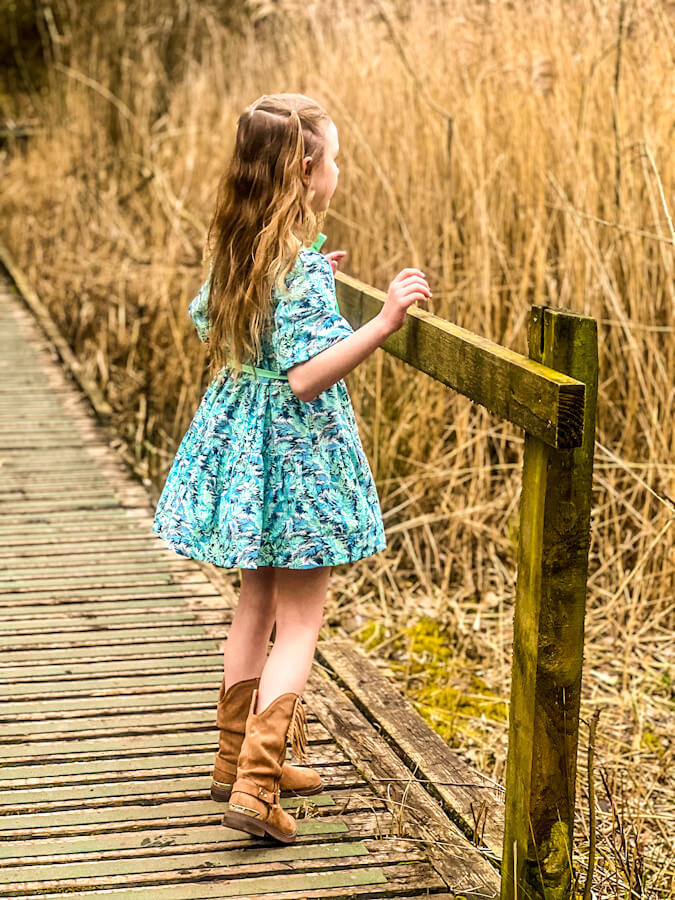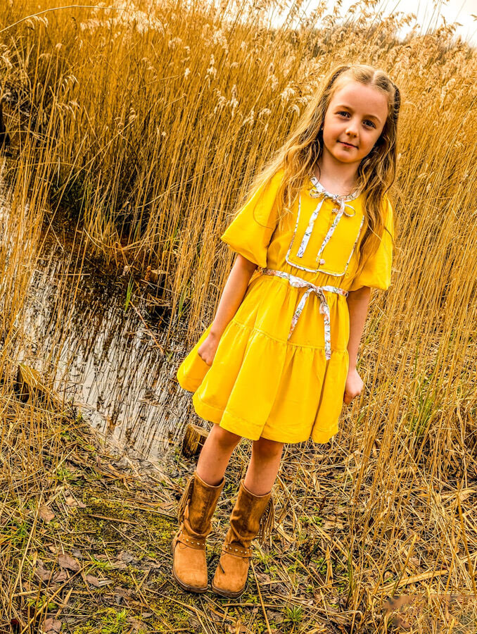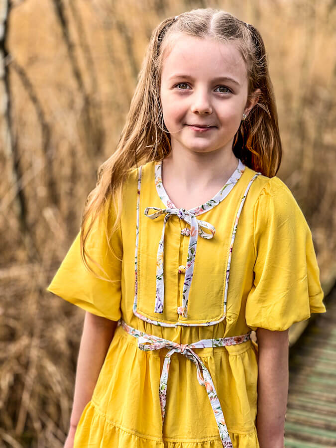 The Freya Sewing Pattern is a timeless, vintage-inspired top and dress pattern designed for girls, tweens, and women, offering exceptional versatility and classic charm. Perfect for spring and year-round wear, Freya is ideal for woven fabrics such as cotton, linen, and soft florals. This sewing pattern features a beautifully detailed, fully lined plastron bib on both the front and back, delicate bodice gathering, and fully lined puff sleeves with no elastic for a polished finish. Freya can be sewn as a hip-length top or as a tiered dress in either standard or vintage length, with the option to add a removable tie waist for a more defined silhouette or wear it as a relaxed babydoll style. Available in girls’ sizes 2T–9/10, tweens’ sizes 10–16, and women’s sizes 0–20, the Freya pattern is thoughtfully designed for comfortable movement, growth, and heirloom-quality sewing projects that blend vintage boho style with modern wearability.