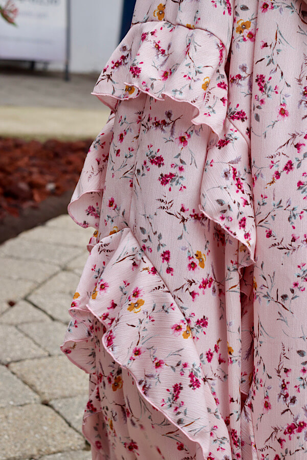 Fully lined sleeveless, princess seam bodice with bodice flounce