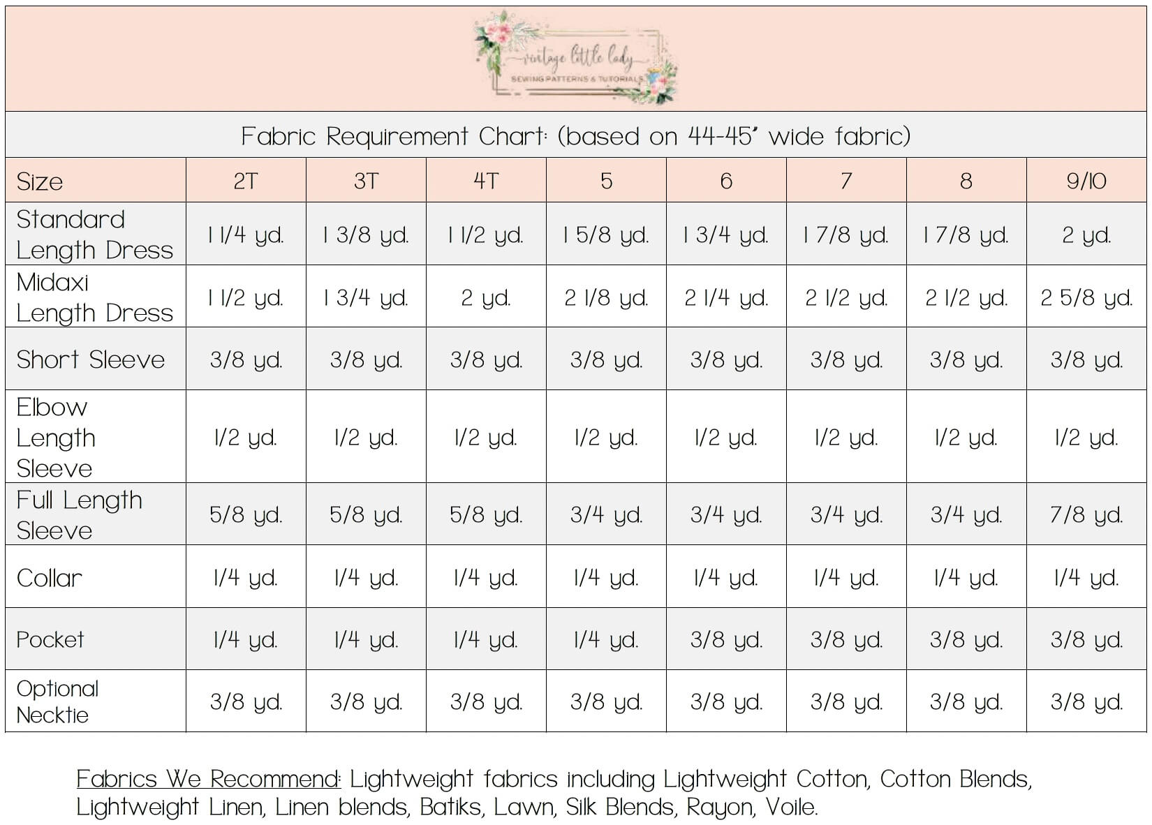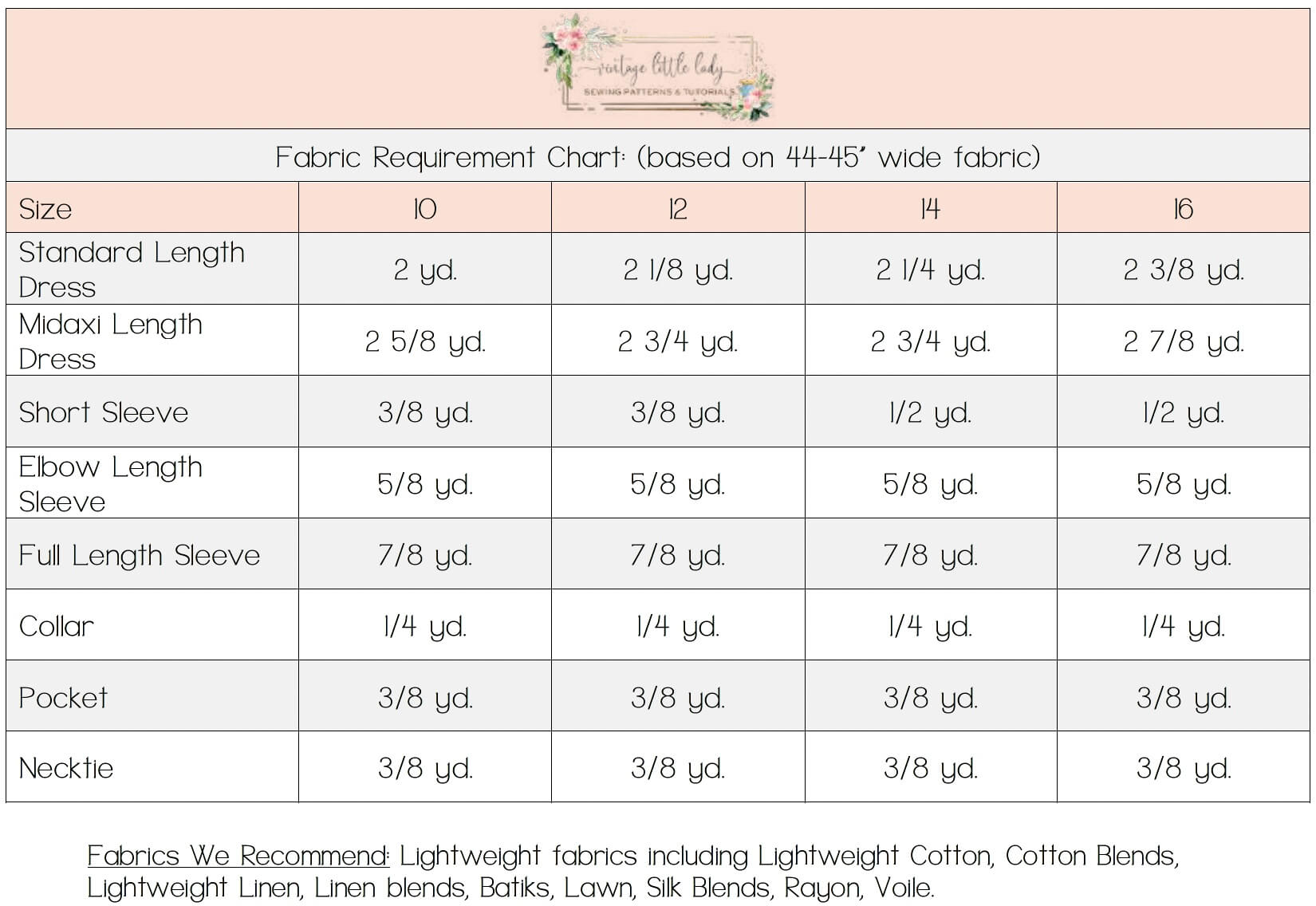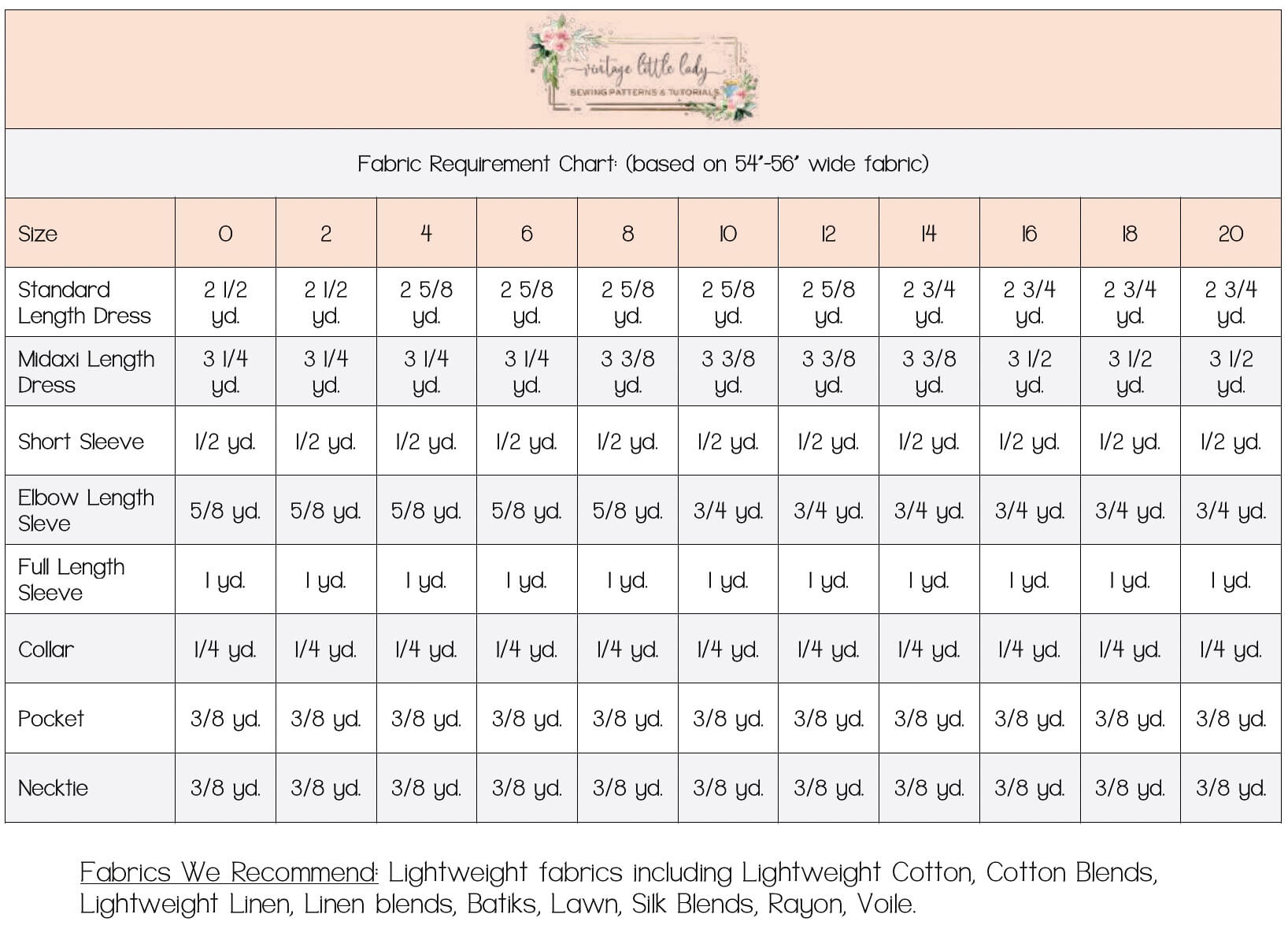 - Size charts, fabric recommendations, fabric requirements, sewing tips, notions, cutting diagrams, pattern piece layout, printable body measurement record & body measurement indicator diagram